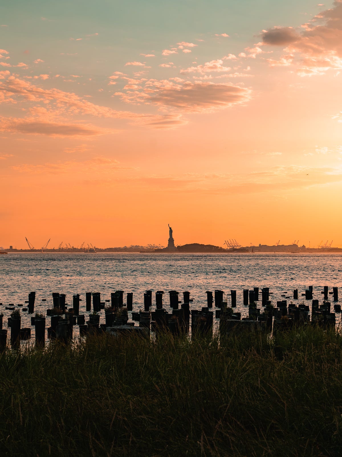 This is a hidden gem that provides an unobstructed view of the Manhattan skyline with wooden pilings in the foreground.