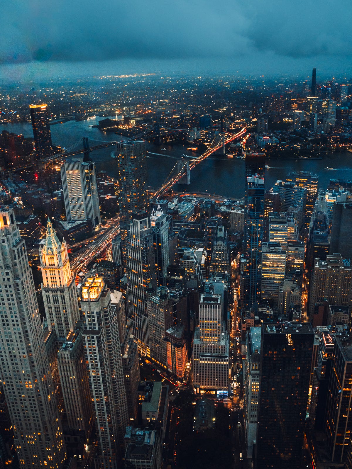 View from the One World Observatory deck Photography Tip: Avoid glare from the glass windows by using a lens hood or pressing your camera against the glass. A polarizing (CPL) filter can help reduce reflections.